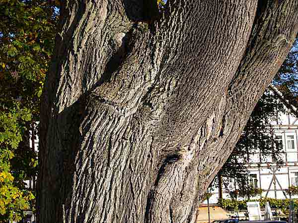 Knorrige Baumrinde im Licht der tiefstehenden Sonne