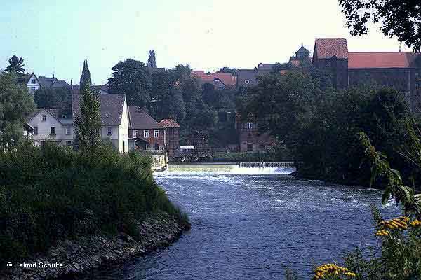 Ein Nebenarm der Werra. Im Hintergrund ein Teil der Stadtmauer vom Ortsteil Allendorf, davor ein Wehr.